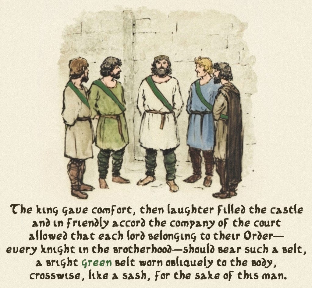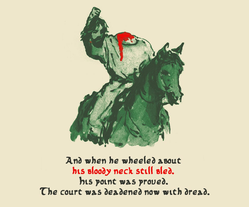 The Giant swings, and the blow lands causing a slight nick to Gawain’s neck. The Giant is none other than the lord he sheltered with just a day before, who reveals his name is Bertilak. The entire beheading game has been a ruse put in place by Morgan Le Fay. Gawain is ashamed for the use of the sash, which is the cause of the nick in his neck. Bertilak proclaims him blameless, and Gawain returns to Arthur a hero. Arthur’s warriors vow to wear a green sash to remind themselves to remain true.