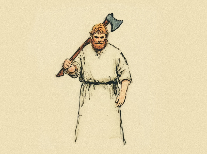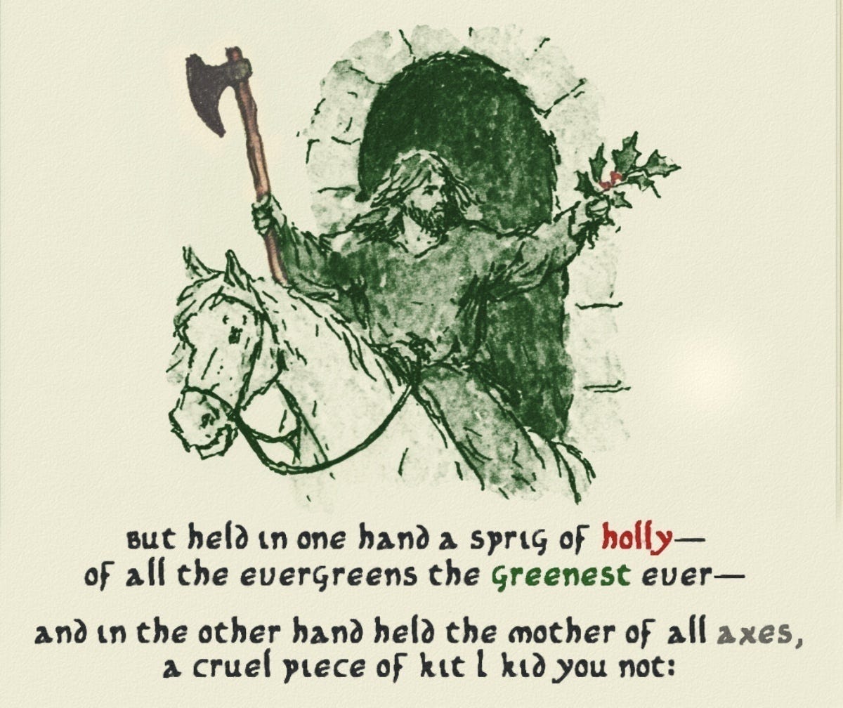 A giant of a man entered the hall, riding a horse, carrying the ‘Mother of all Axes’ and a holly bough. The man’s stature was by far the least remarkable thing about him, as his was green from head to foot. He wore no armour, but his hair, skin, tunic, and hose were all green. The giant is not there for a fight, for he finds that no one amongst Arthur’s court to be a match for him, but instead proposes a friendly Christmas game: The verdant colossus would take a blow with the axe from any man, as long as that man would take the same stroke in a years time. As a reward the man to join in the game would get the enormous axe.