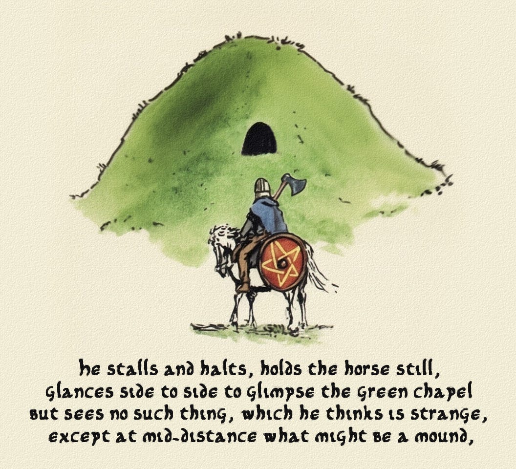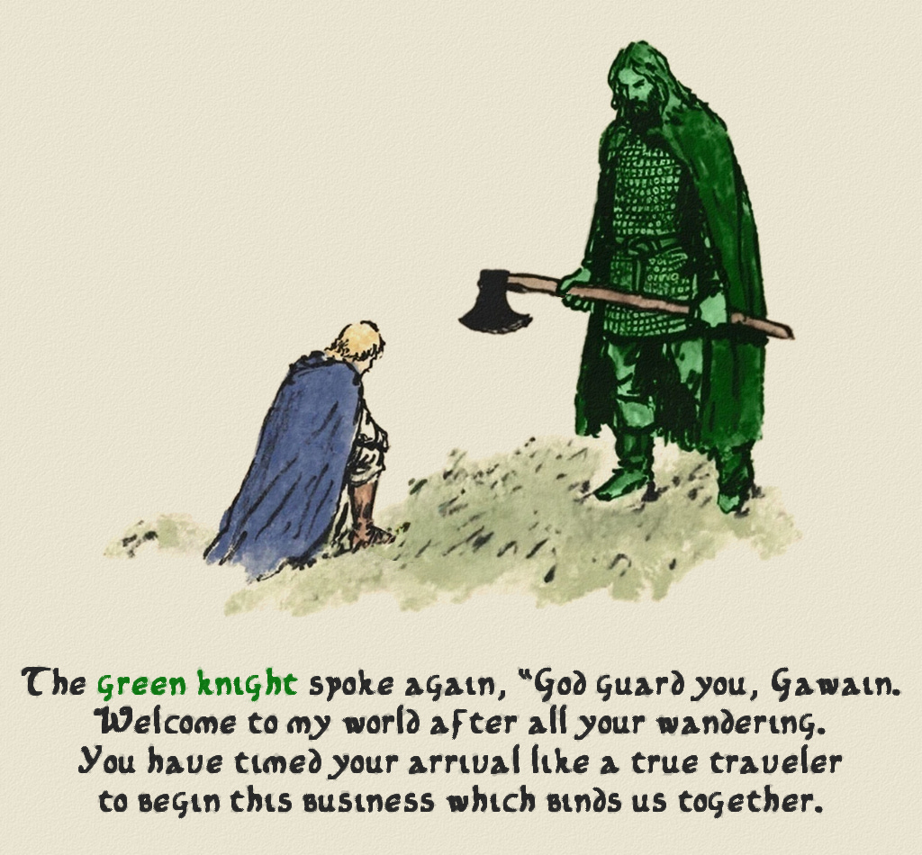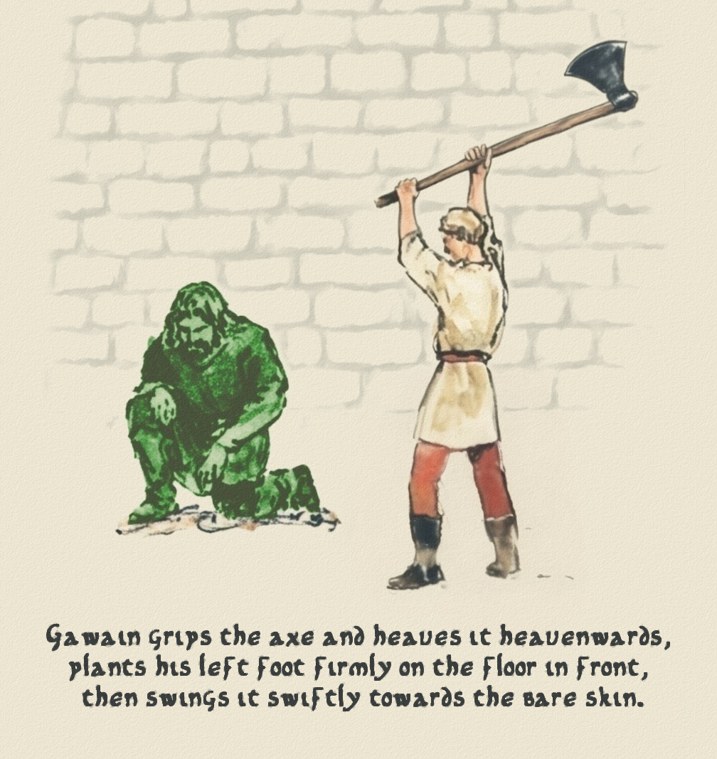 Gawain then sets out for the Green Chapel, which is a cavern in a green mound. The green man awaits sharpening his axe. Gawain bares his neck to receive the dutiful blow. Upon the giant’s swing young Gawain flinches.