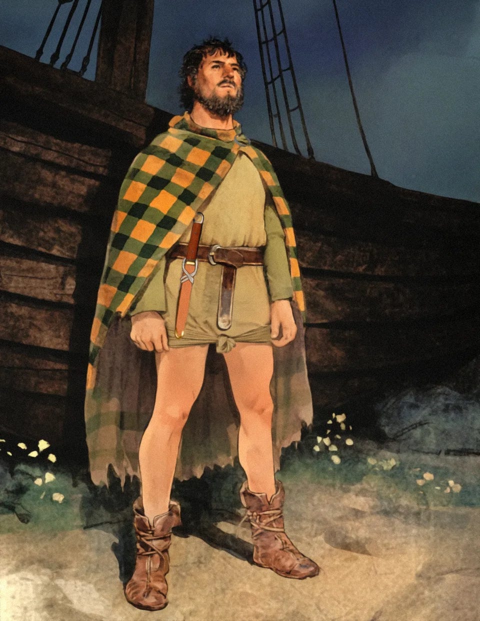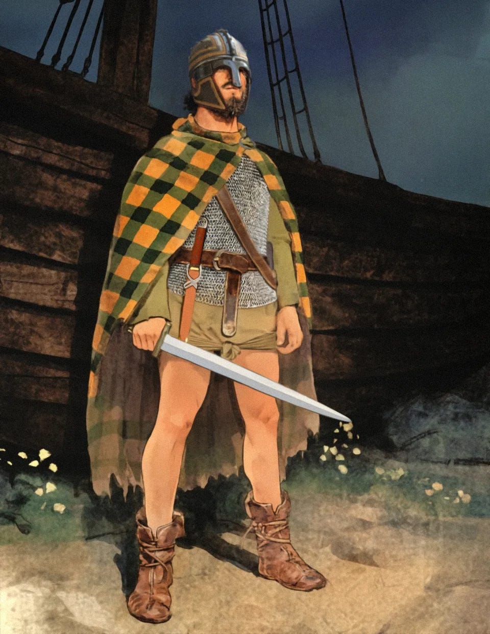 I have chosen to depict Niall in a Léine, a long calf to ankle-length tunic popular amongst the Irish and early Scots. His tunic is girded around his legs to allow for enhanced mobility whilst aboard a ship or fighting. He carries a belt knife as a general purpose everyday tool and if necessary weapon. He wears a simple leather belt, and a plaid cloak with a silver penannular brooch. He wears simple boots of leather tied at the top.